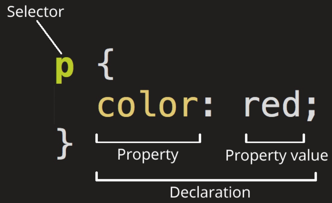 선언은 구체적으로 어떠한 스타일을 선택자에 적용할 것인지 지정합니다. 이 선언은 속성과 속성 값으로 이루어져 있는데, 속성은 적용하고자 하는 스타일의 종류를, 속성 값은 해당 속성을 정확하게 어떤 값으로 지정할 것인지를 결정합니다.