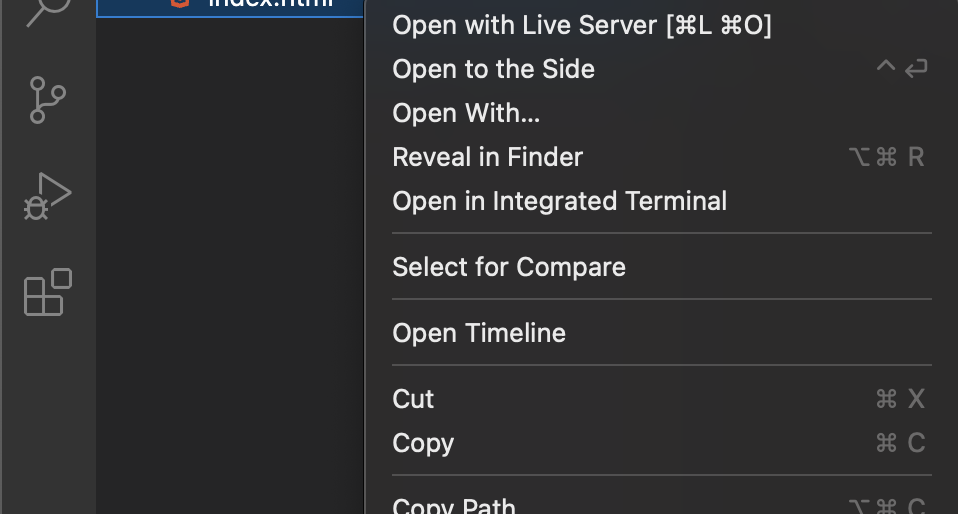 혹은 파일을 오른쪽 클릭해서 보이는 메뉴 중, Open With Live Server라는 메뉴를 클릭해 주시면 됩니다.