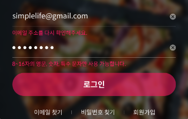 // 로그인검증기능 만들기 function validation(email, password){ if(!email.includes("@")) { alert("이메일 주소를 다시 확인해주세요.") return false } else if(8<=password.length && password.length<=16){ alert("8~16자의 영문, 숫자, 특수문자만 사용 가능합니다.") return false } else { return true } } // 로그인검증기능 사용하기 const email = "email&naver.com" // 사용자가 입력창에 입력한 이메일을 변수에 담기 const password = "1234" // 사용자가 입력창에 입력한 비밀번호를 변수에 담기 validation(email, password) // false